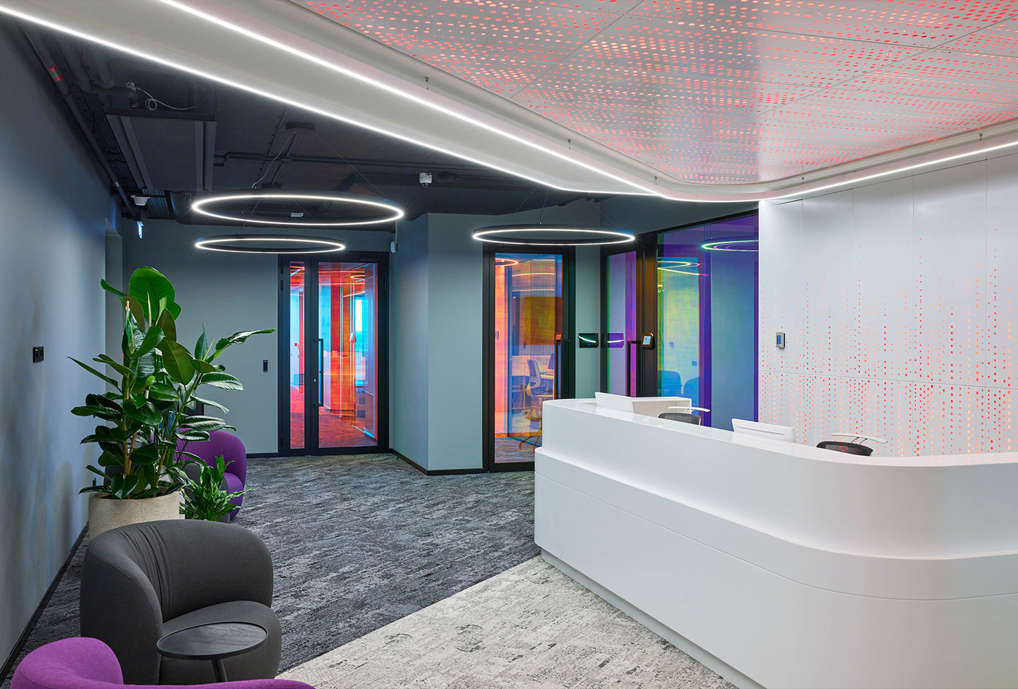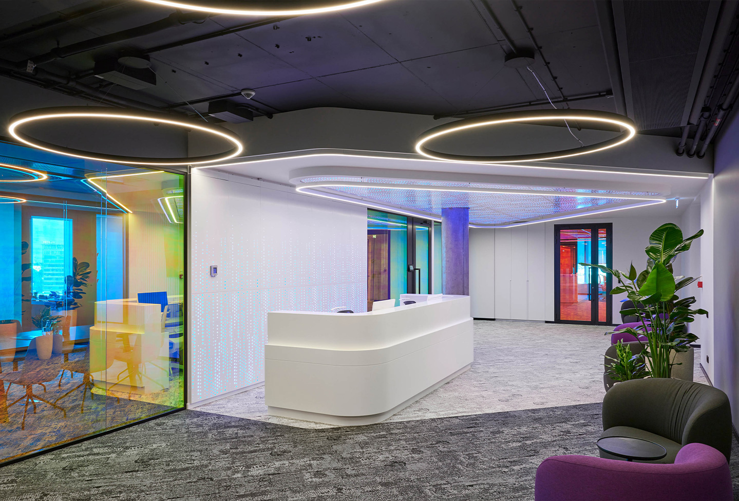 Gaismas un krāsu sniegums. Gaismas un krāsu spēle, gaismas dinamika interjerā, krāsains stikls, kas lauž gaismu, telpas iracionalitāte, atspulgu spēle, augstās tehnoloģijas.RGB apgaismojums.