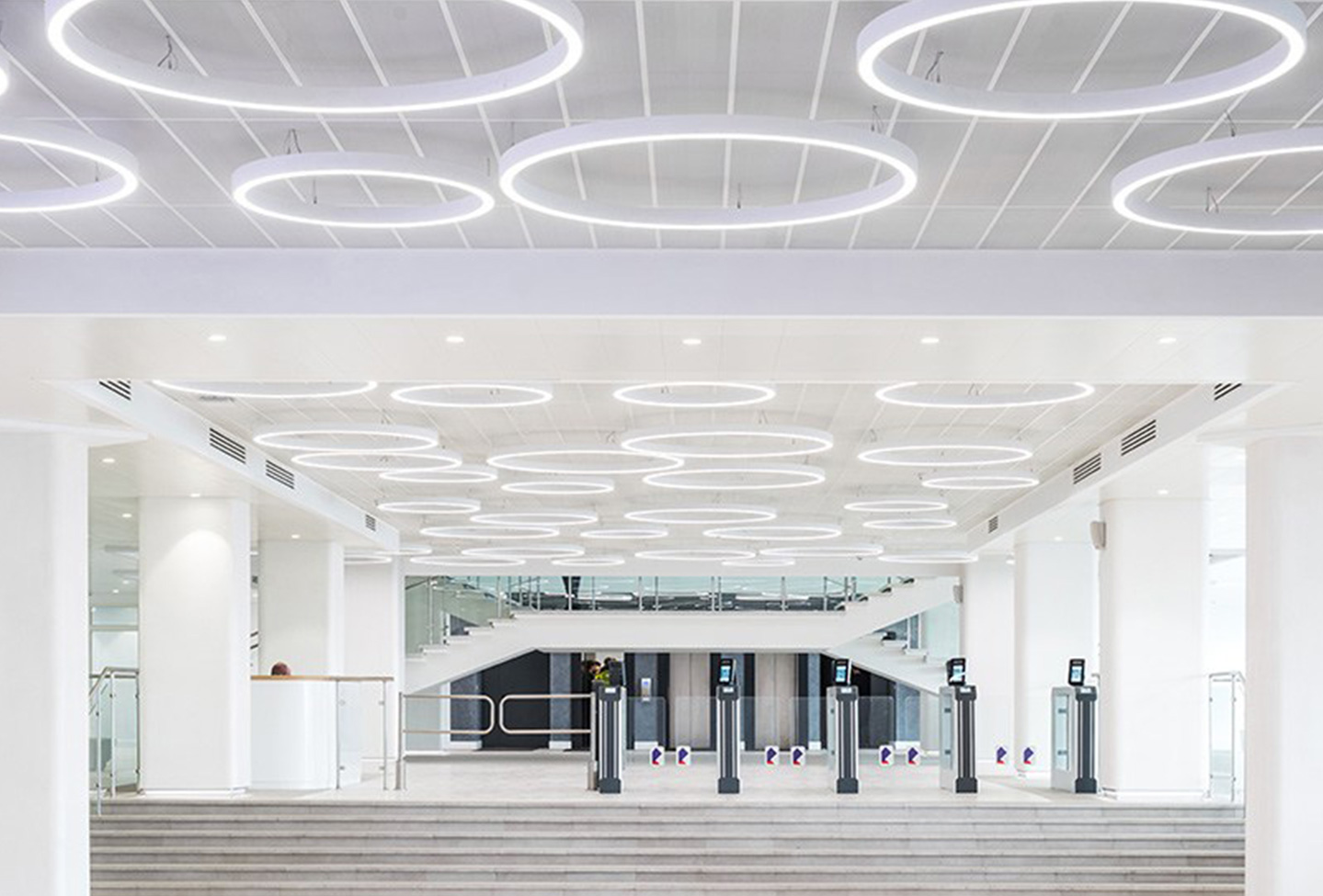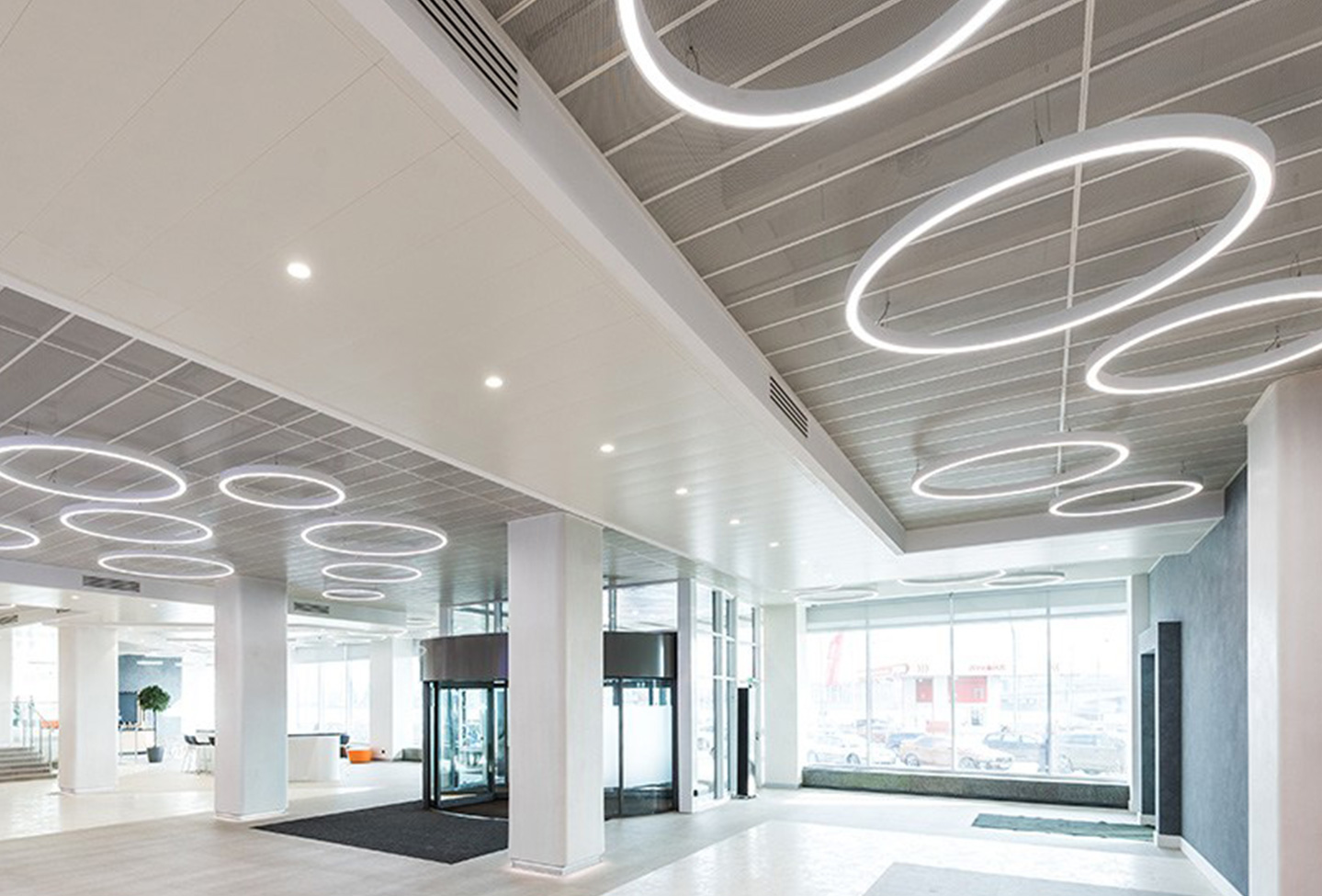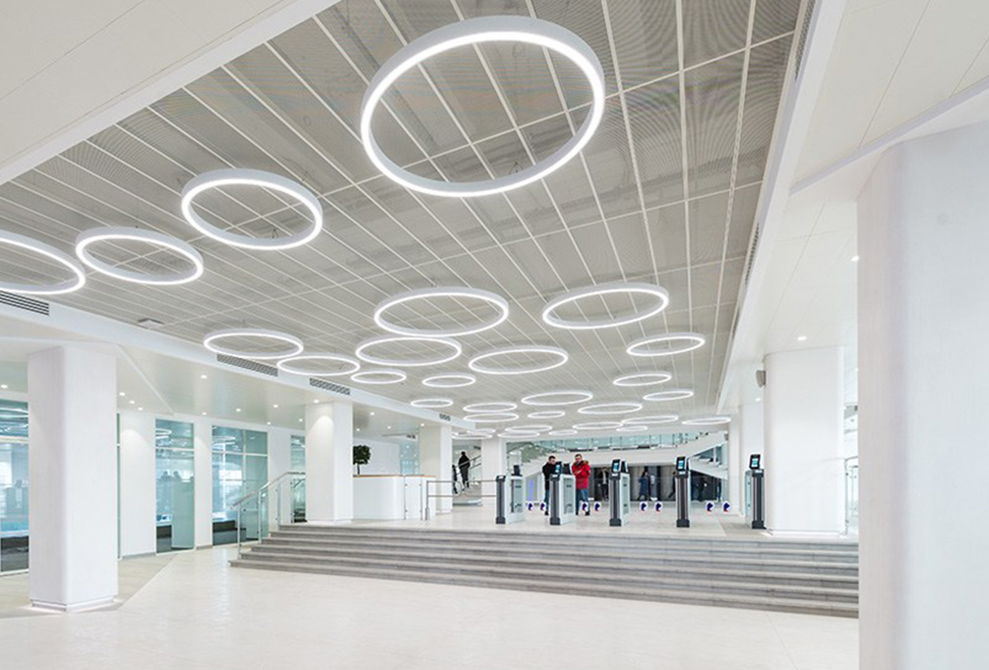 Ieejas zona, pirmā stāva halle. Interjers pārsteidz viesus un darbiniekus ar savu kontrastu ar pilsētvidi (eksterjeru). Kristālbaltas virsmas ar daudz gaismas un pārdomātu loģistiku rada nākotnes augsto tehnoloģiju uzņēmuma tēlu.