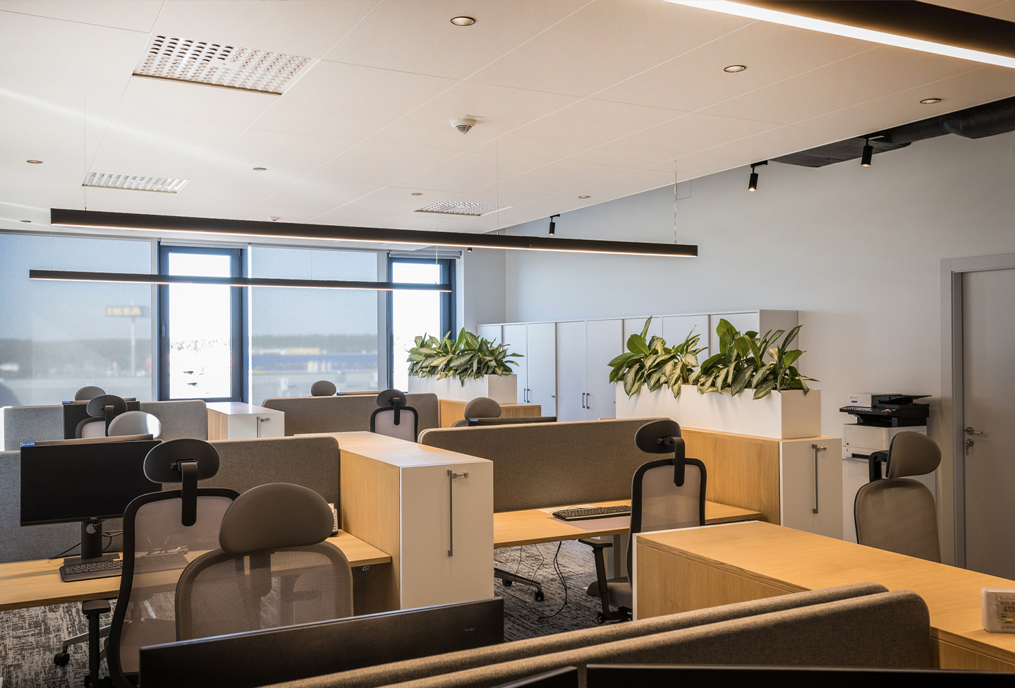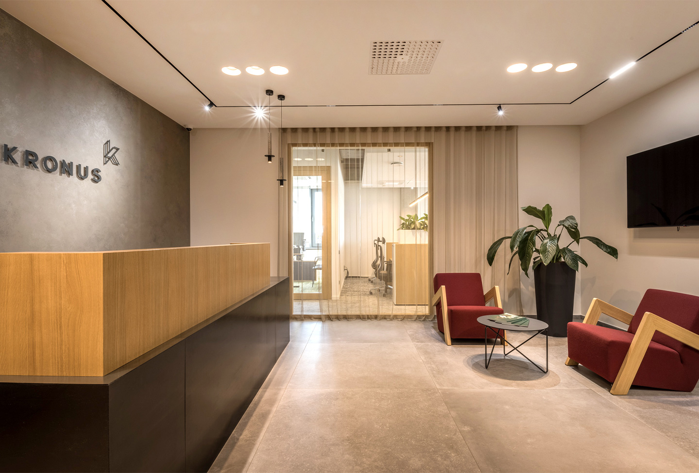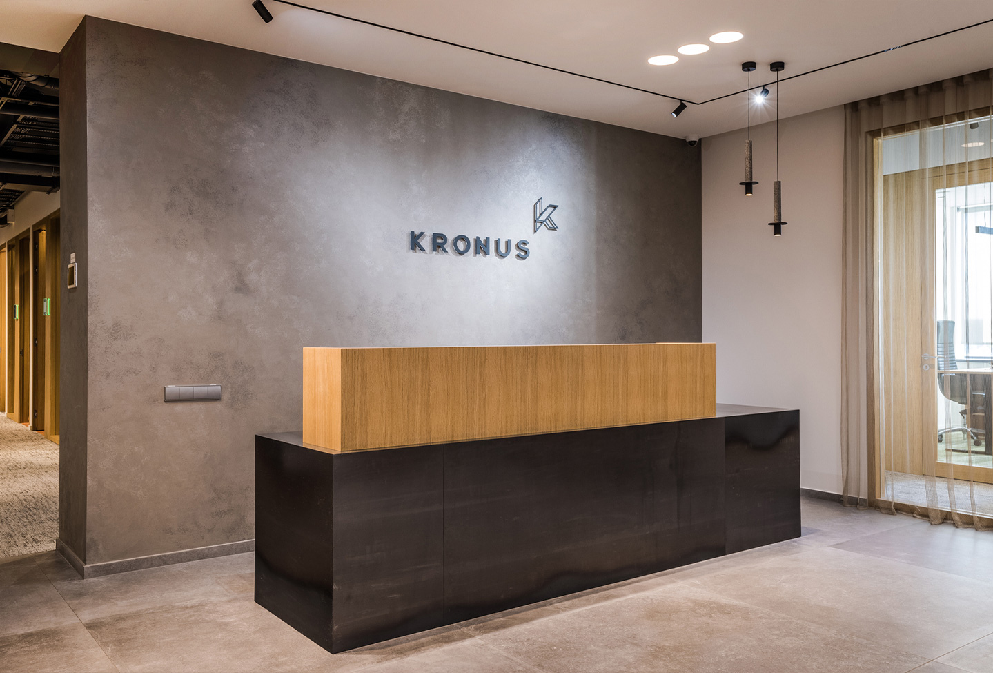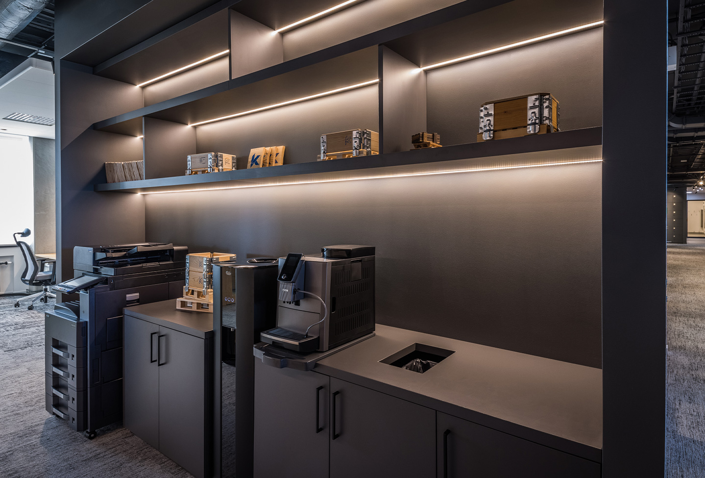 Stingrās un lakoniskās formas atspoguļo uzņēmuma industriālo virzienu. Materiāli ar izteiktu tekstūru (metāls, paklājs, apmetums, atklāti krāsoti griesti ar atvērtām komunikācijām). Silts koks mīkstina brutālas materiālu faktūras.